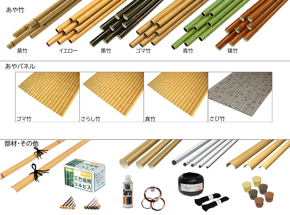 天然竹の特徴である「節」をリアルに再現した『人工丸竹』葵竹と、カラーバリエーション豊富な あや竹シリーズは、軽量で耐候性に優れたAS系樹脂で作られています。バリエーションに富んだ部材で、自由度の高い施工が可能になります。